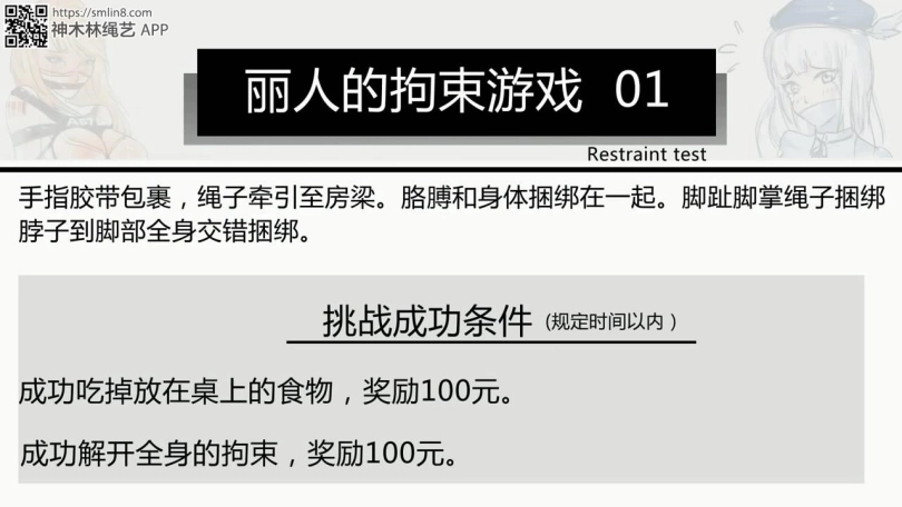 很明显灵感来自日本的紧缚实验,这个系列一开始非常有趣,但是长期的解缚太过单调,于是自己有了灵感,如果让美女被用奇特的方法捆绑,然后来完成各种游戏是不是会更有趣,于是带着这种想法制作出了中国版的紧缚试验,但内核做了改变,如果喜欢的请支持一下~