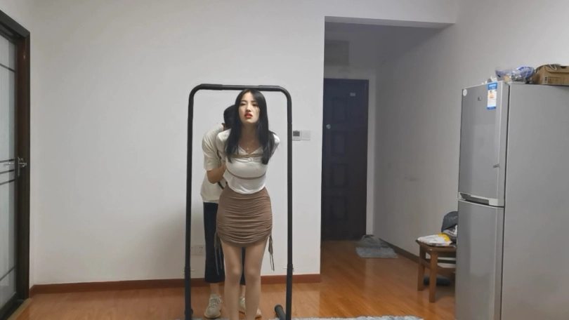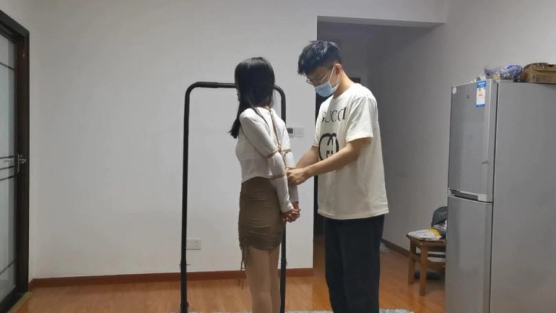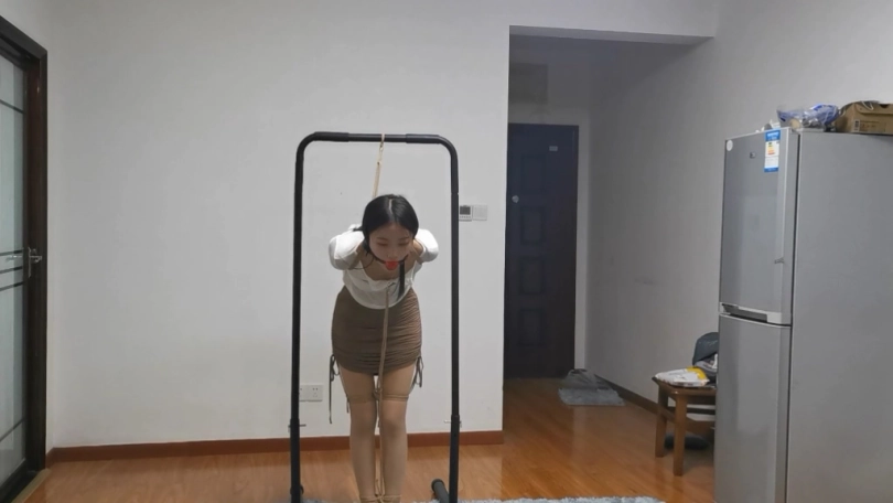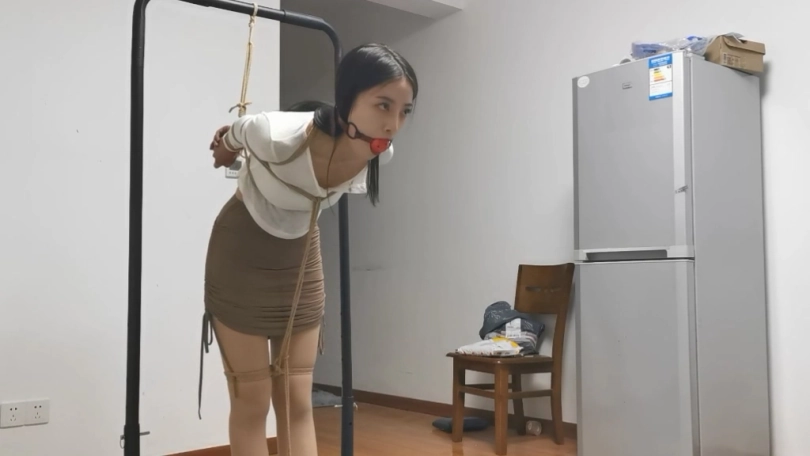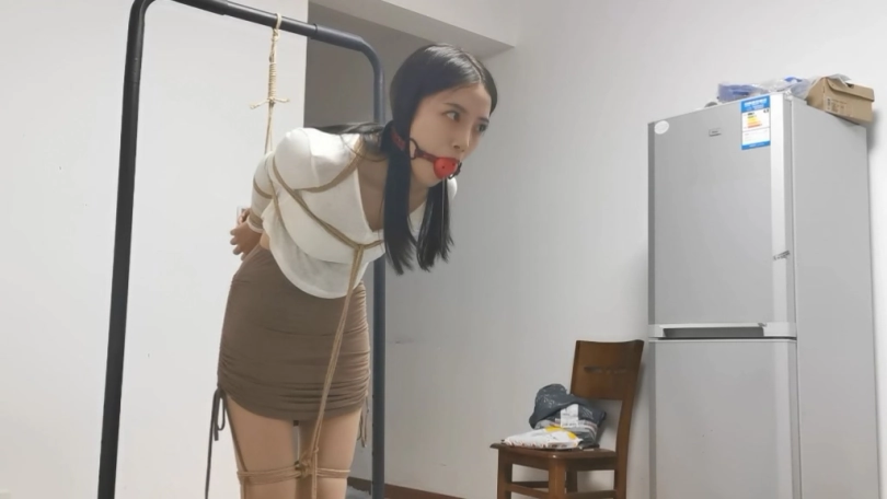 长相文静的00后大学生兔兔。这次是上半身欧式直臂捆绑,绑好后用绳子后手吊在架子上,模特只能弯腰来缓解吊缚的疼痛,但是身前接着把胸前和膝盖的绳子连接到一起拉紧,模特就只能保持这种弯腰又弯不下去,想伸直又直不起来的难受姿势,而模特如果想强行直起来腰就要承受缚胸绳子收紧的拘束感。最后再给模特戴上口球,静静的欣赏口水慢慢流出来的画面。