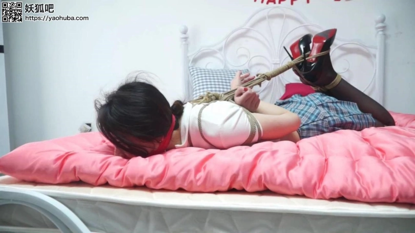 模特柳洋被捆成海老缚姿势戴上口球,放置在床上口水太多止不住的一直往下流,最后用丝袜堵嘴,塞满胶带裹上几圈,绑上驷马模特发不出一点声,放置在床上挣扎。