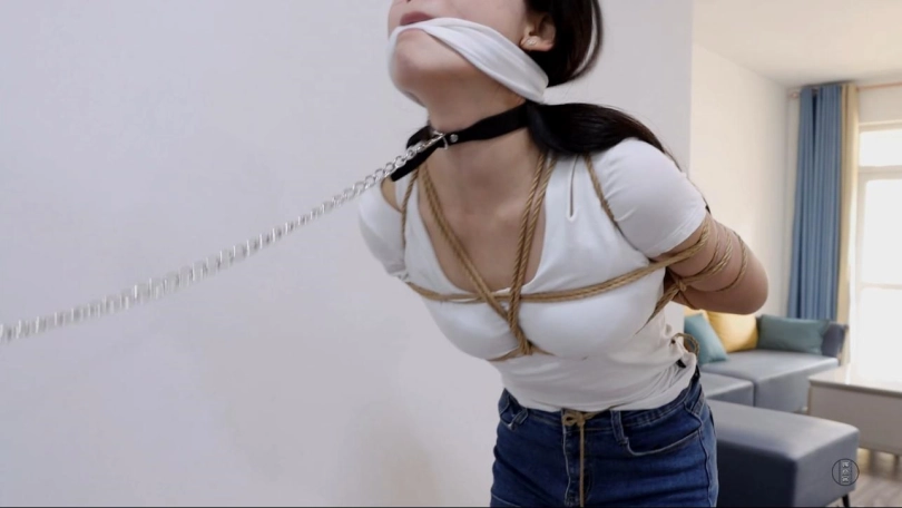 那些臭袜子便成了堵塞她污言秽语的有效刑具,被塞得满满的小嘴发出甜美的呻吟,被绳索捆绑的身躯更进一步的宣誓着她被奴从的身份,手指被铐上拇指铐,金属的质感令她更加屈服,穿着白棉袜的双脚被绑上绳镣,如古代的囚犯、又如待宰的动物一般被拉着行走,一切都那么屈辱,可胯间的股绳却让她不能轻易的陷入愤恨。