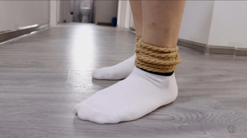 为她准备的最后一个项目,便是跪缚。将双手吊起,强制身体只能跪在那里,双腿绑好后甚至连脚趾也没放过,跪缚是最能让一个人反省的姿势(大概面具人的想法便是如此)