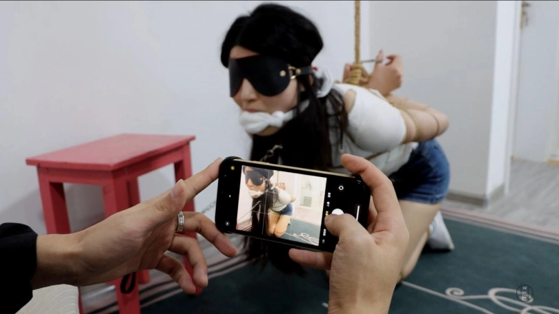 亮点:牛仔短裤,过膝白袜,四只船袜严密堵嘴,原味棉袜堵嘴,后手吊缚+拇指铐 项圈牵引,股绳牵引(跪姿爬行) 蒙眼堵嘴后跪缚+后手吊高放置