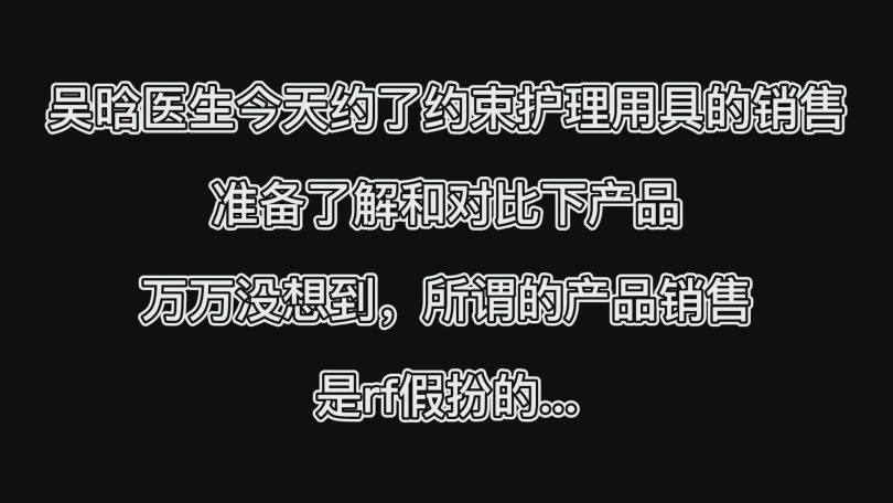 吴晗医生今天约了约束护理用具的销售准备了解和对比下产品,万万没想到,所谓的产品销售是rf假扮的!单纯的她接受了“销售”产品试穿的提议...