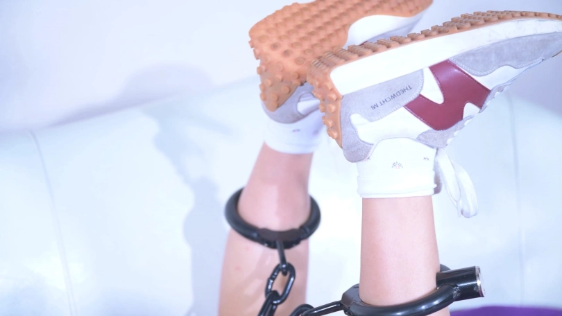 萱萱穿着超短JK、白袜和运动鞋在沙发上玩镣铐,玩着玩着就把自个儿铐上了,但是她发现她并不会开锁。这时,一位“好心人”进来了,萱萱向他求助,他耐心地教他如何开手铐,但是顺势把她双手反铐,把脚镣和手铐相连,并戴上手指铐。萱萱从一脸懵X到绝望呻吟,还被戴上口球脱去鞋袜玩弄脚。元素还挺多的。