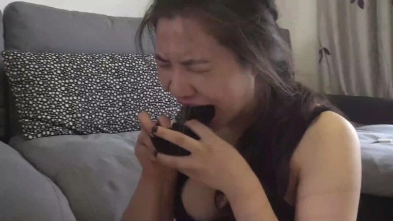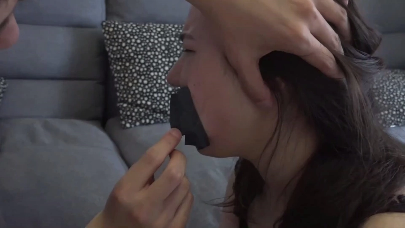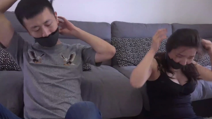(三)大胸美女李沐子与自己男友上门讨债反遭对方严厉捆堵,还被对方把脚上原味臭袜子塞到他们情侣二人嘴里。李沐子的男友经过努力挣脱帮李沐子解开,随即二人撕掉封嘴绷带胶带以及嘴外宽胶布,李沐子男友拽出口中女劫匪的一条原味肉色裤袜,再帮李沐子拽出口中男劫匪一双原味黑色锦纶丝袜。