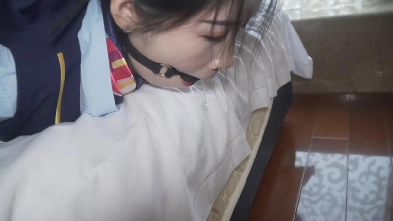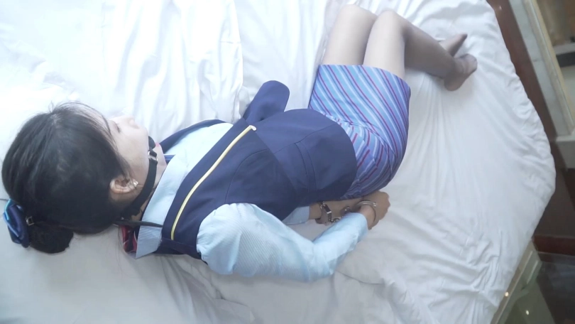 有没有金属手铐,镣铐爱好者?长腿亮丝气质空姐,下班后被玫瑰金手铐绑住,戴上口球口水直流~~