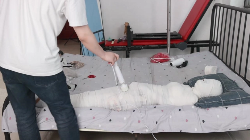 被抓回来的女孩被胶带缠绕数道,又被袜子堵嘴外面用胶带紧紧缠绕,再用绷带全包露出脚丫,疯狂挠痒痒。