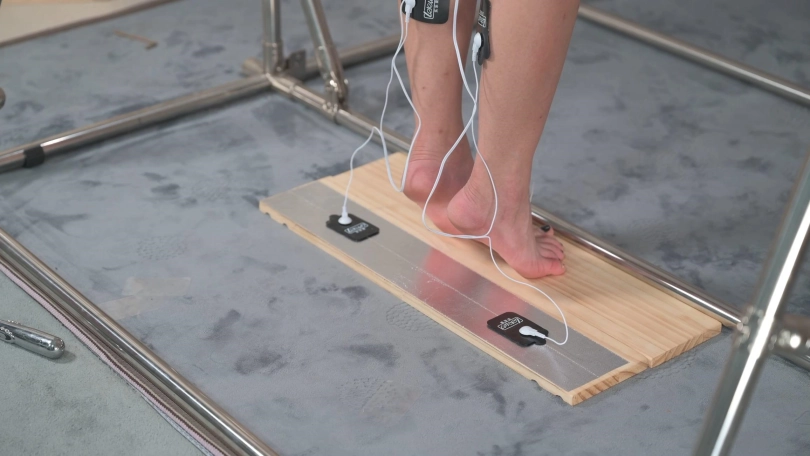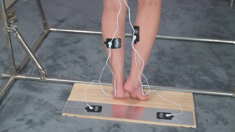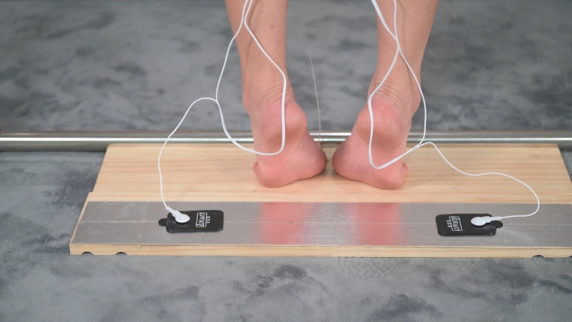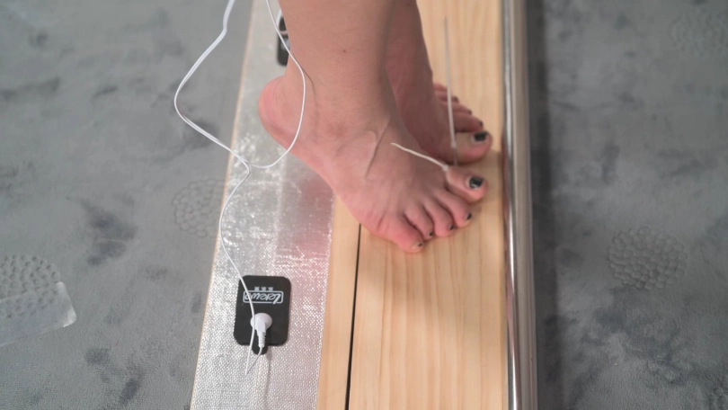 这个装置的设计是绳师最喜欢的刑罚之一,把汤圆的脚趾用扎带勒紧,双手吊起但绳子不收紧,腰部用铁腰带固定,腿上和脚后跟接地的地方接上电极片形成闭合,一旦她感觉累了,脚跟着地的时候就会被电击,同时固定脚趾的扎带很紧,由于疼痛,她会一直想脚跟着地,这样进退两难的感觉看起来真的很棒。在过程中,绳师还用另一个电击器和刺轮,电击和扎她的腿部,影响她的平衡。
