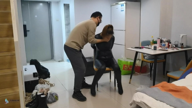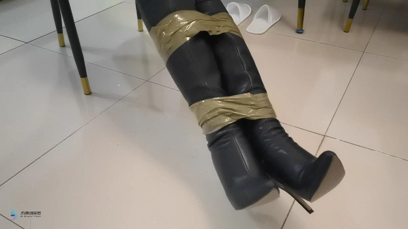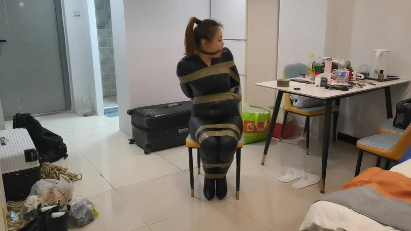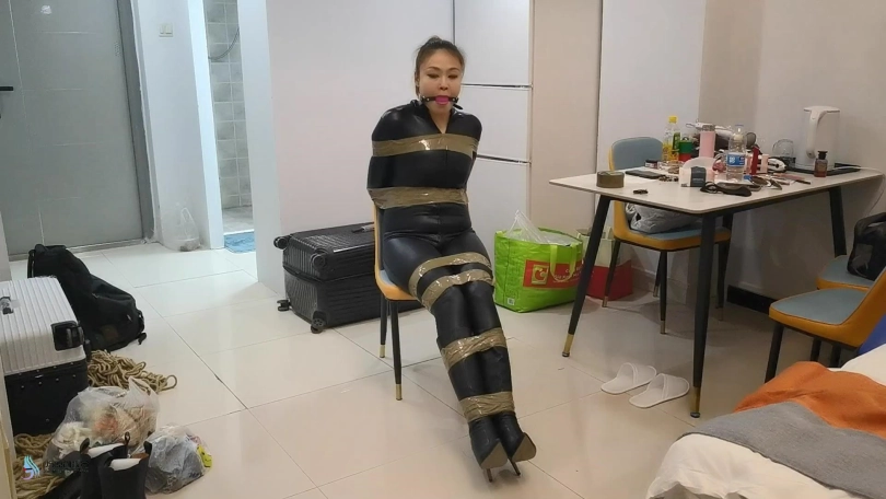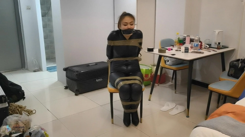 女贼潜入房间偷窃,被房主抓住,用胶带捆绑起来,口球堵嘴。然后换丝袜塞嘴,在用胶带封嘴。