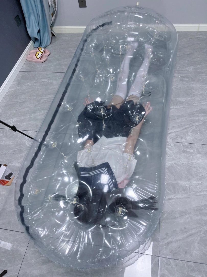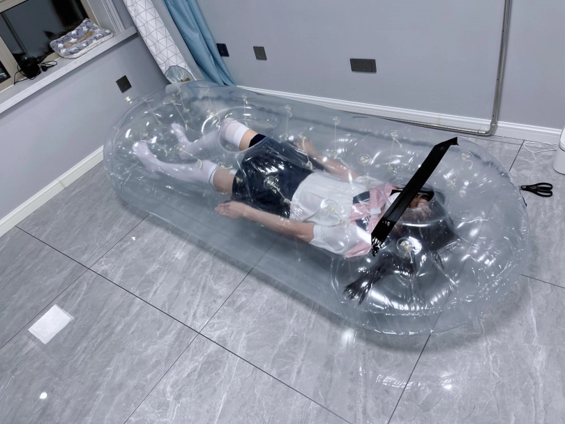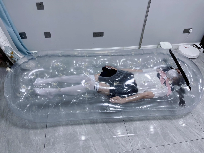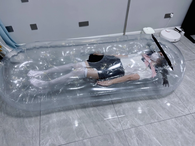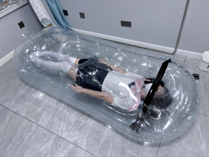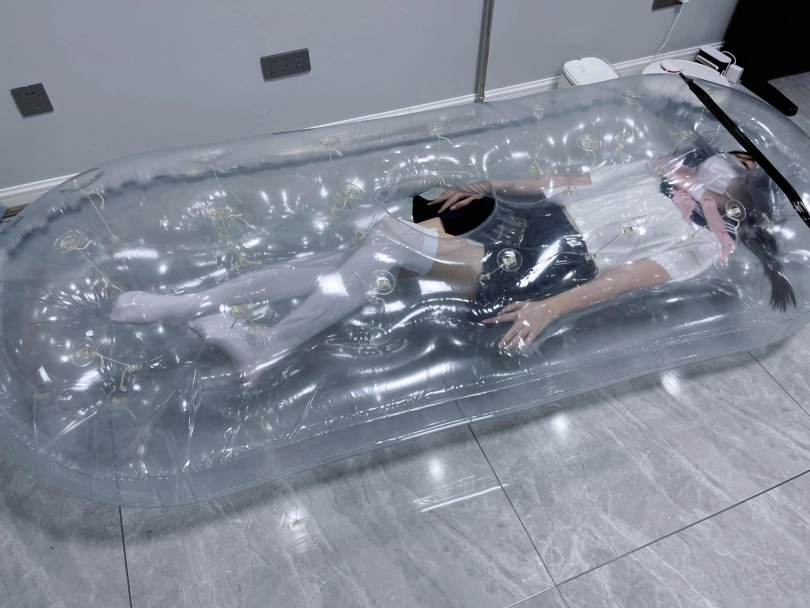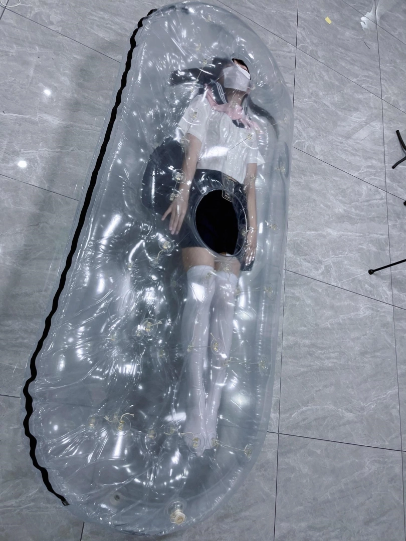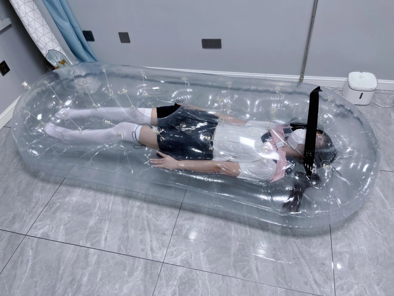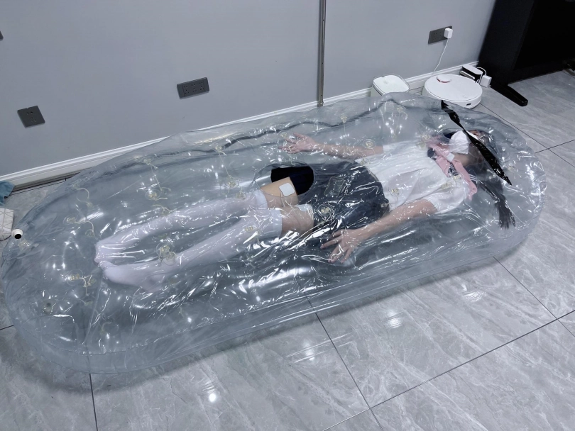 先让茶茶带好郊狼、遥控玩具进入充气床,然后充满气拘束。充气床充满气体之后的感觉类似真空床,区别就是真空床是被气压吸住,而充气床是用两个充气气垫死死压住少女的身体。