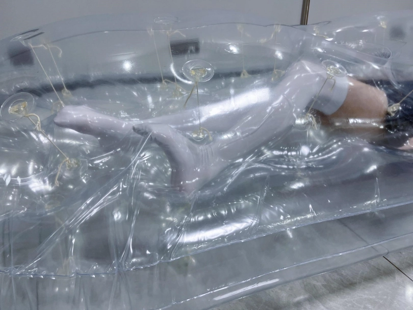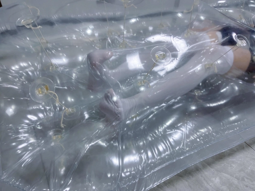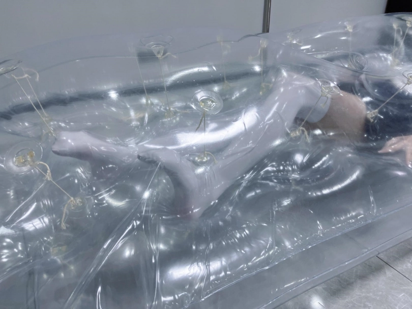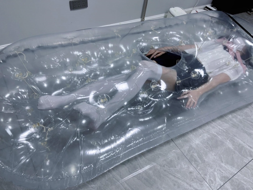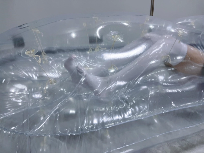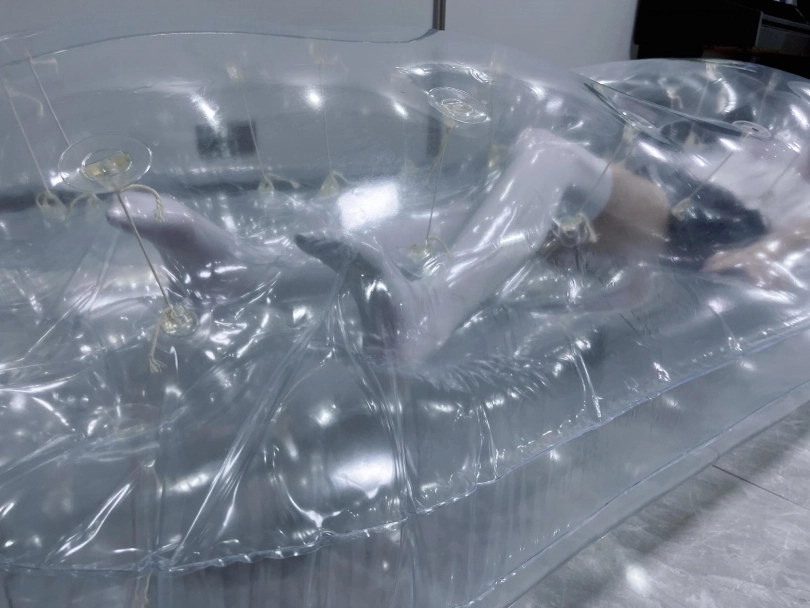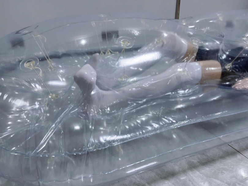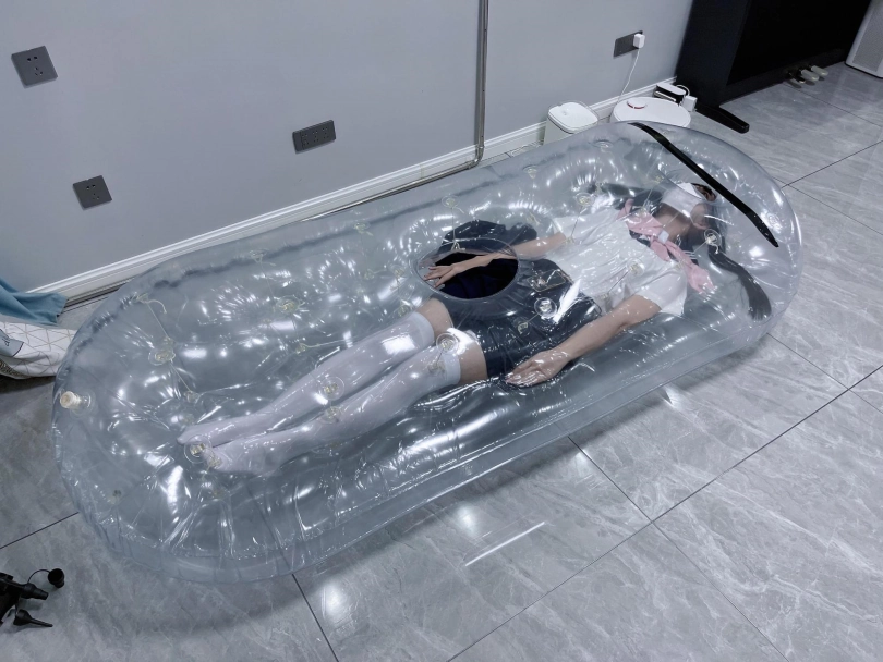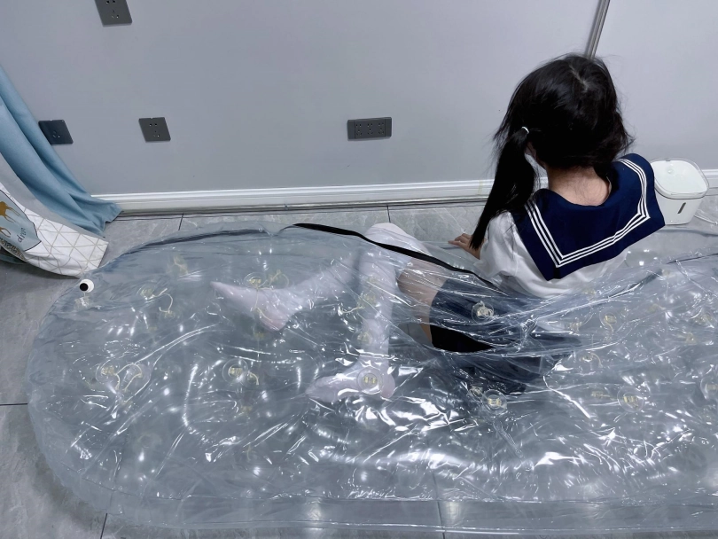 先让茶茶带好郊狼、遥控玩具进入充气床,然后充满气拘束。充气床充满气体之后的感觉类似真空床,区别就是真空床是被气压吸住,而充气床是用两个充气气垫死死压住少女的身体。
