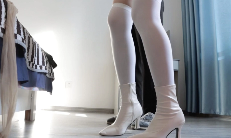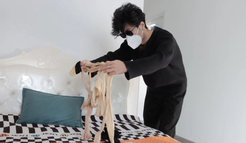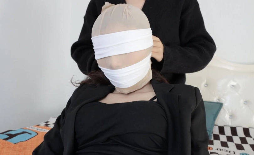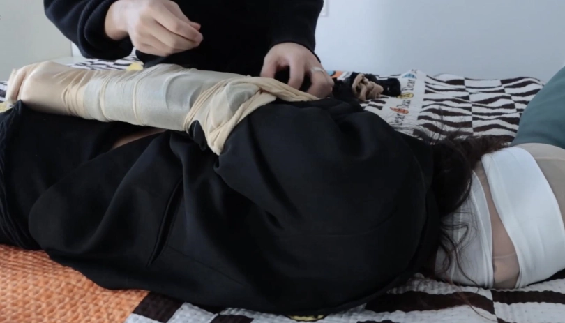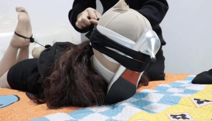 开始抚摸白领的身体,丝袜包头,脱下高跟鞋,脱下白领的白丝长筒袜蒙眼蒙嘴,随后用丝袜包手,给白领换上鞋子用中筒丝袜连高跟鞋一起包脚,并用一些丝袜束缚住放在床上。随后劫匪开始拨弄拉扯丝袜,摆弄双脚。。一番玩弄之后,劫匪去找钱财。白领醒来后挣扎,想要起身拿手机,被劫匪发现后逼问白领手机支付密码,白领不情愿,劫匪怒。于是决定换一个姿势惩罚,劫匪脱掉高跟开始抚摸,随后将白领穿的肉丝脚尖打结绑在一起,丝袜包手然后丝袜驷马。