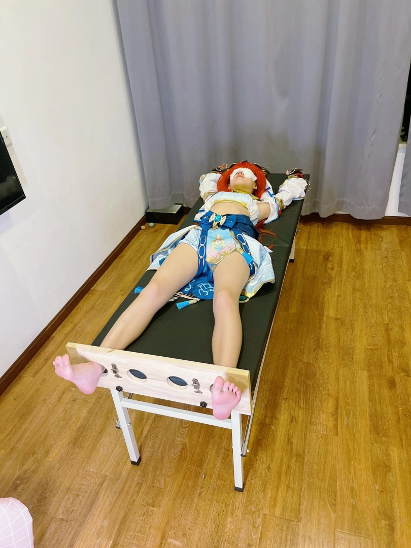 她知道,这次痒刑不会那么简单,因为身边提高敏感度的精油、高强度电击拍、刺轮等挠痒道具应有尽有。与之对应的,她的双手被迫铐在脑袋上方,粉红色的小脚丫也固定在足枷里。