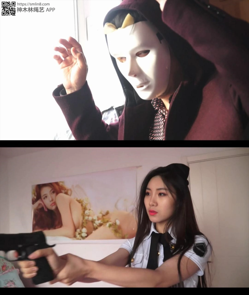 卧室,一个带面具的坏人在搞一些瓶瓶罐罐的东西。这时一位女警举枪冲进了房间