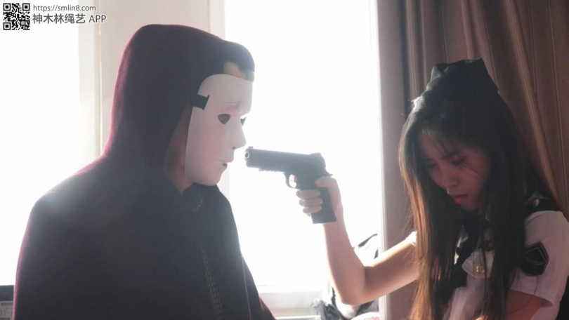 女警费了九牛二虎之力终于直起身子,用头撞门把,但可惜,还是没用。