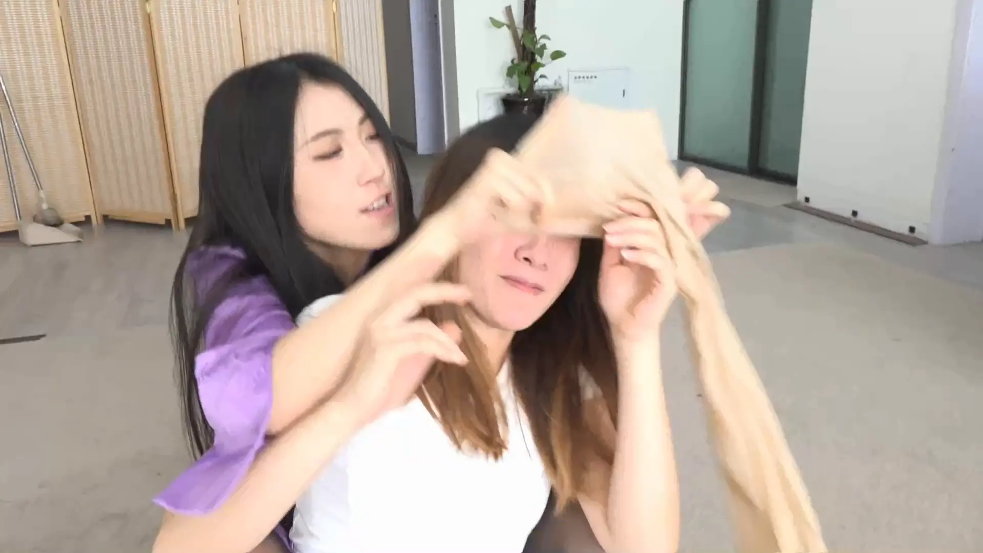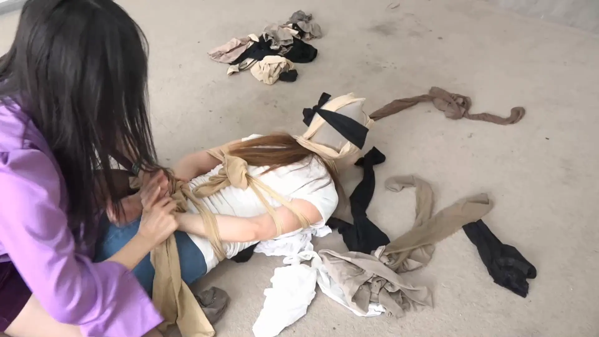 失去视力的她,更加丧失战斗力,被楼上的美女生生的按在丝袜堆里,捂晕。随后,楼上的美女,逼迫她也穿上性感的包臀裙+高跟鞋。