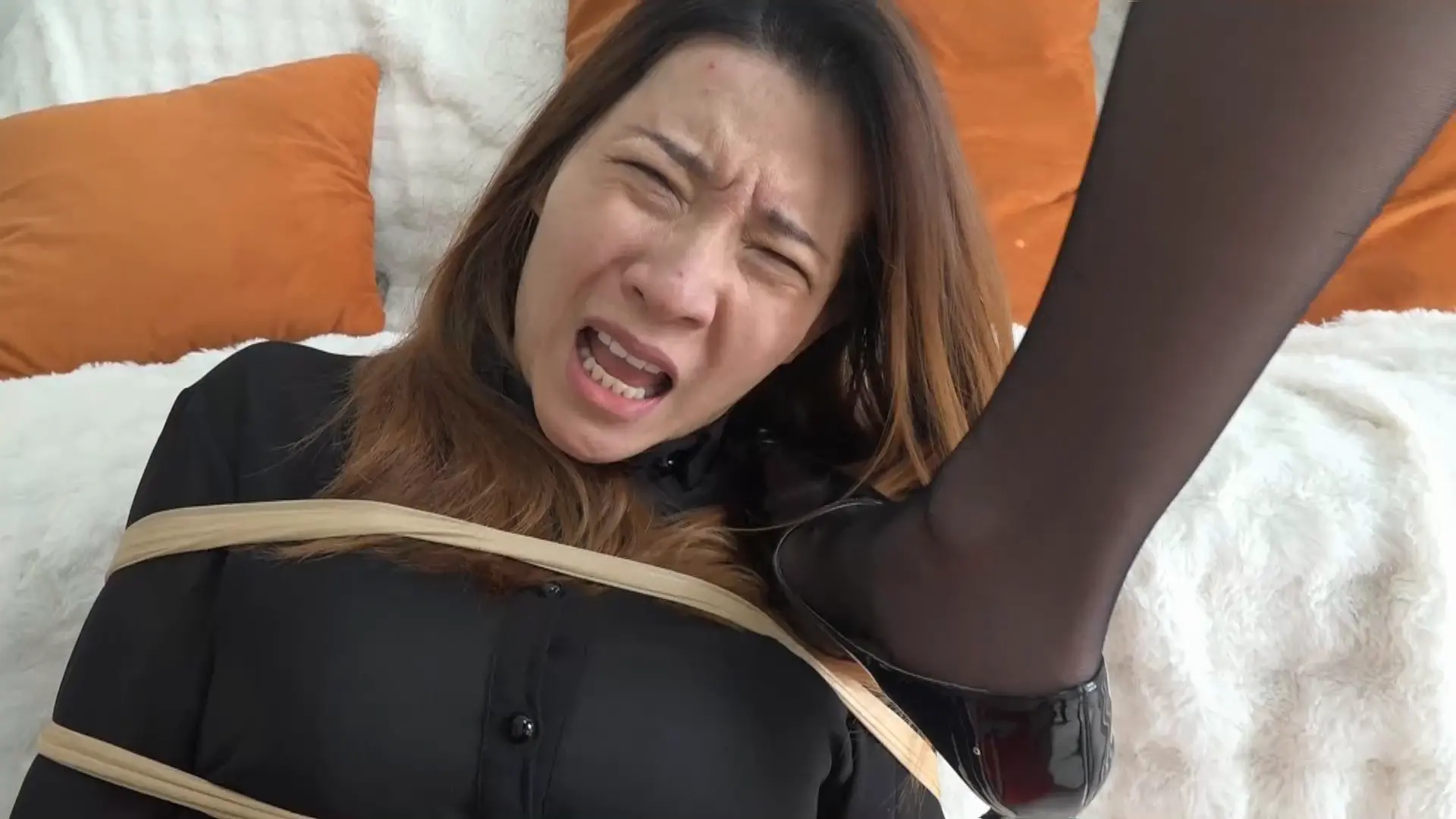【逍遥】[楼上的高跟鞋声- 上]楼上的美女每天都穿着高跟鞋走来走去,惹怒了楼下的美女,随后2人在理论中打斗起来。楼下美女不敌,被丝袜捆绑全包,并被逼着穿上高跟鞋,被逼着喜欢高跟鞋