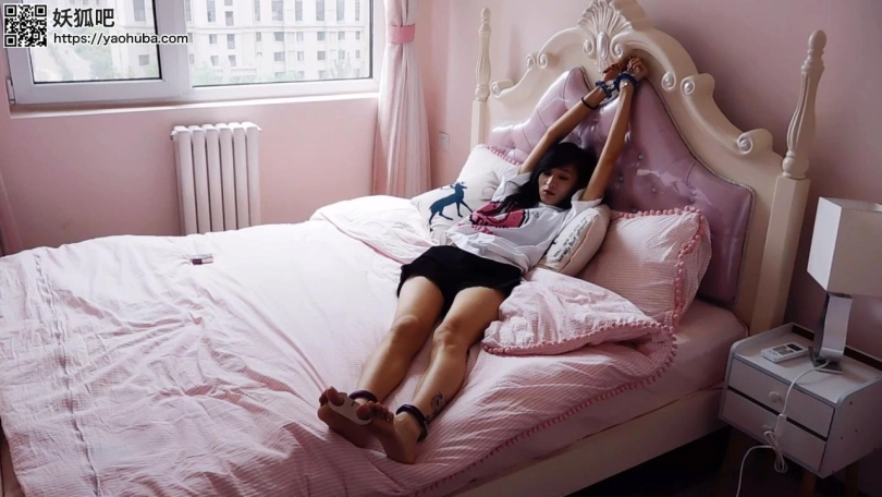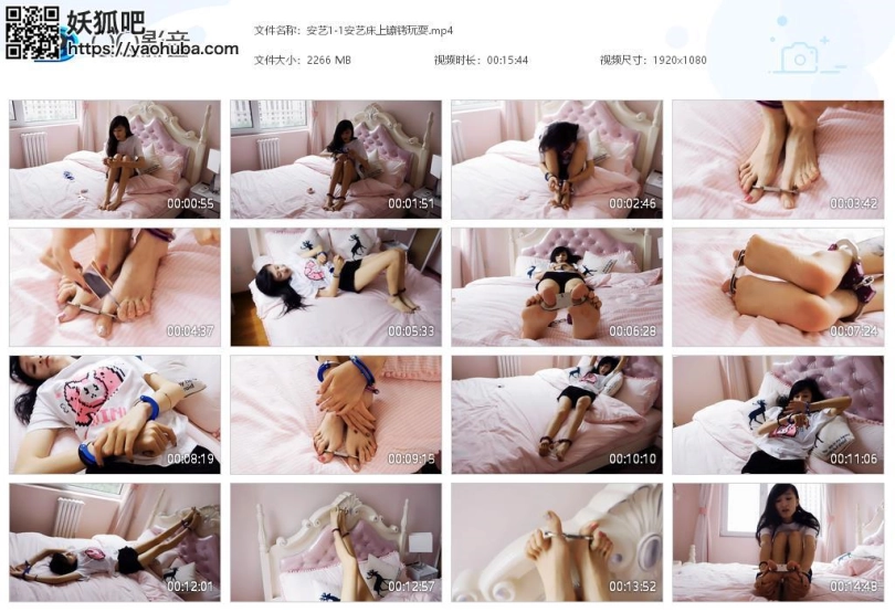 妹子回家,坐到床上,脱下鞋子,袜子,戴上手铐、脚铐、脚趾铐。涂指甲油。展示,换不同姿势。