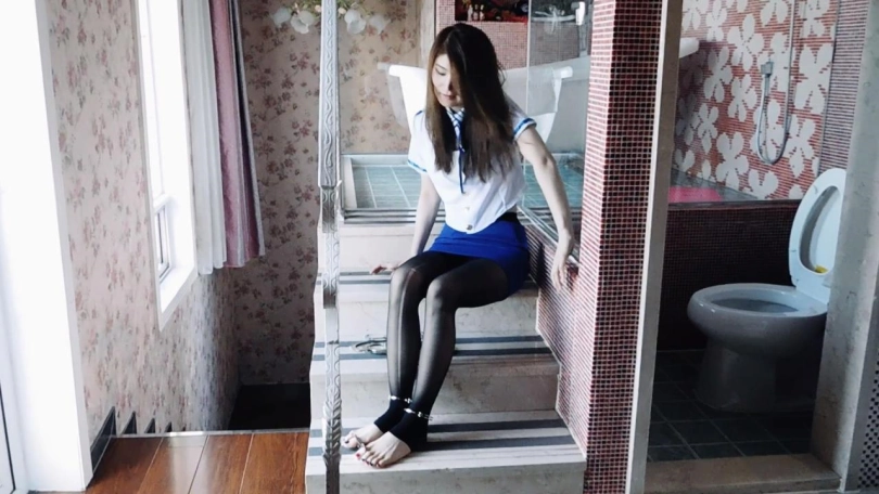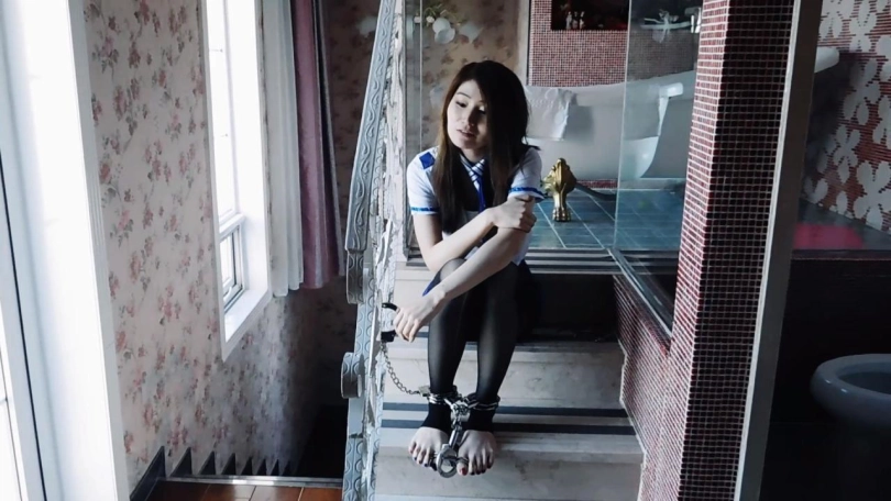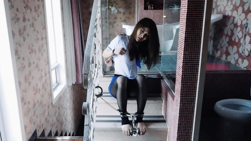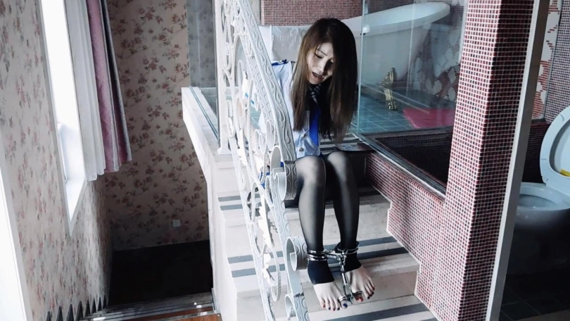 空姐妹子被投诉了,心情烦闷去喝闷酒,酒醉回家,躺在床上,恍惚间见到一个脚趾铐和脚铐,想也没想就脱下高跟鞋,撕开丝袜,给自己锁上了。妹子稍微有点意识后,发现自己的脚不对劲,发现锁上了脚铐和脚趾铐,可却怎么也想不起来是怎么弄上去的了,还是迷迷糊糊的状态。妹子找钥匙,下地行走,找了一下,钥匙没找到。然而妹子找到了一个三通、一个脚镣、一个脚趾铐以及一个说明,上面写着,只要再锁上一个脚趾铐,用脚镣拴住一只脚,三通链接脚腕脚趾,就能得到所有的钥匙。妹子也是太迷糊了,竟然相信了,于是照做。然后,玩耍一会。妹子最后又得到一份说明,把手铐锁在背后,最重钥匙就会出现,妹子仍然照做。做好以后,玩了一会,昏睡了过去。当妹子彻底清醒后,被眼前的一切惊呆了,不记得发生了什么,十分惊恐,不停喊叫哭出来。