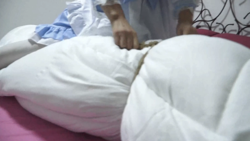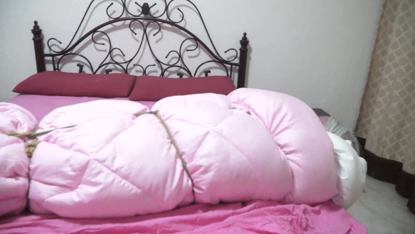 被捆绑包裹在被子里TK惩罚的女孩最终屈服,愿意下跪。但李然改变主意,不愿意放了她,而是将她永远包裹在被子里留在身边,无助的女孩再一次被裹在被子里..