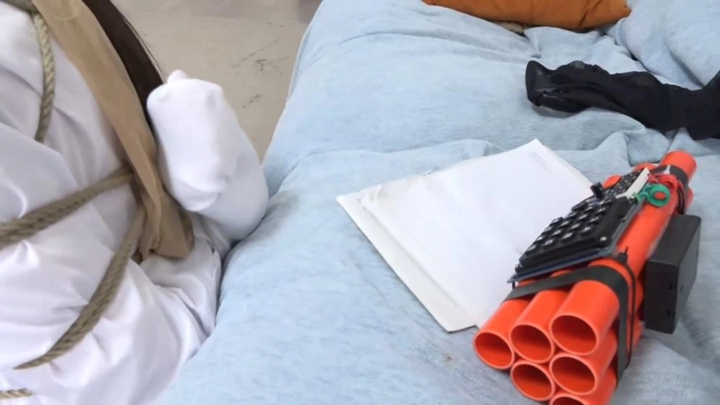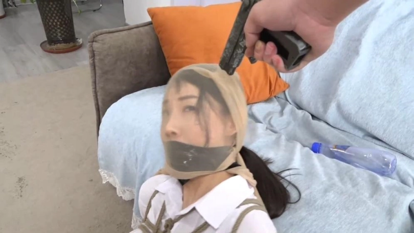女人被拉开黑色头套,被用枪顶住脑袋,女人吓了一跳,接着给她一张字条,示意她念:当你踏进这个房间的时候,门会被自动上锁,炸弹将会自动启动,不要试图解开我,否则炸弹就会爆炸,我将与你同归于尽,办法在字条背面。女人奋力挣扎,试图用手去停止炸弹,发现手被包,有用脚指头去触碰炸弹,但发现也无效,一番努力后想起解除炸弹的办法在纸条,努力用脚把纸条转了个面,然后按照纸条上的字念:要解除炸弹的办法只有一个,就是用你的枪[X_X]我,如果你不想看到我害怕,就用那双丝袜蒙住我的眼睛,女人念完惊恐的呜呜叫,拼命挣扎。