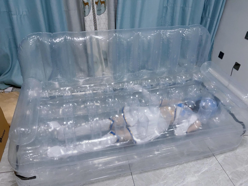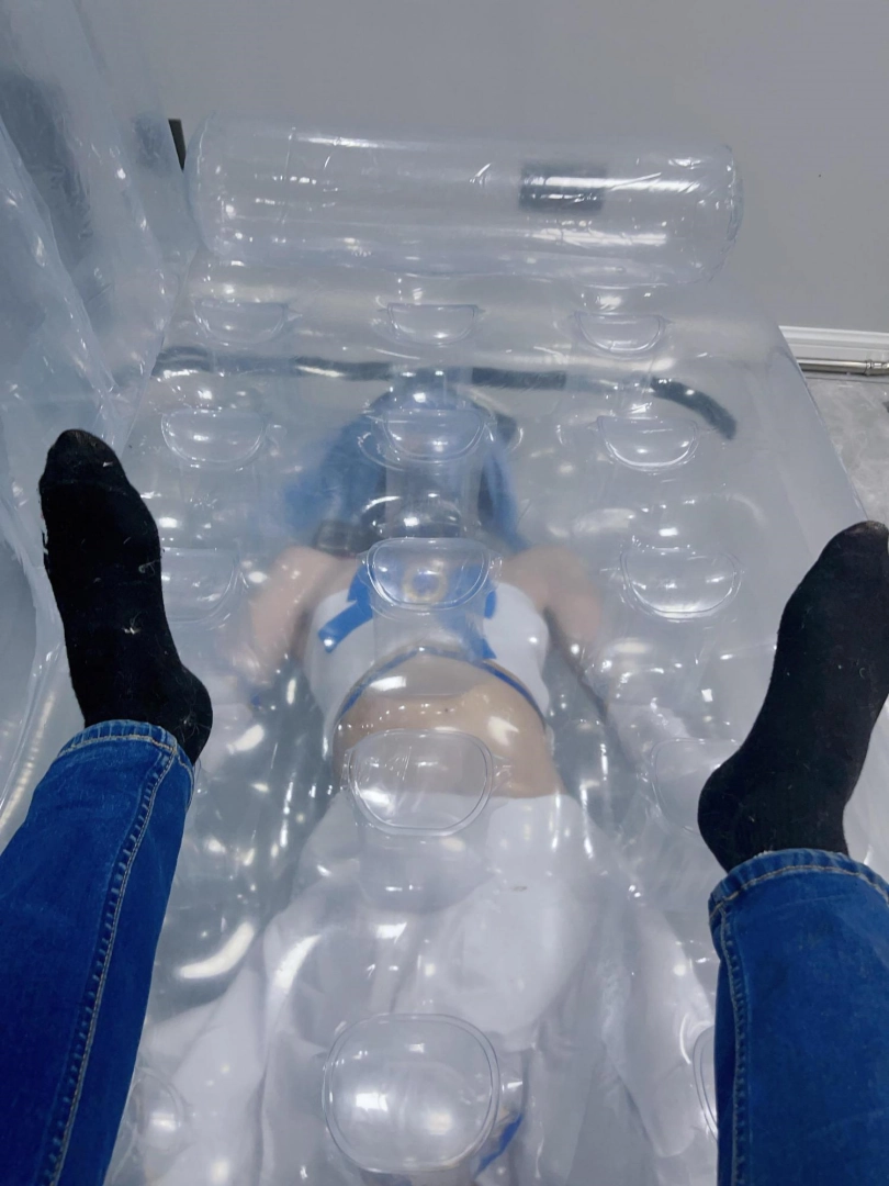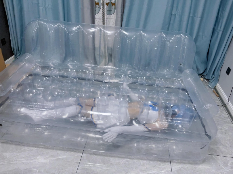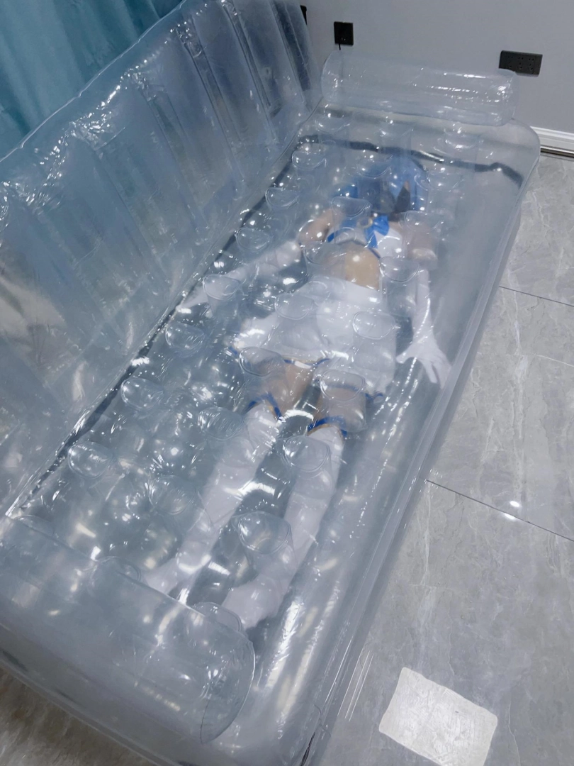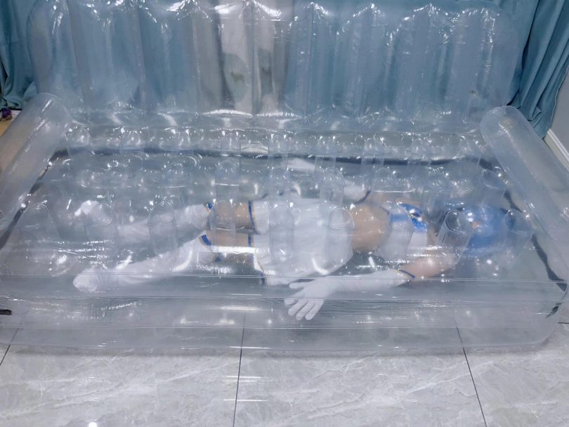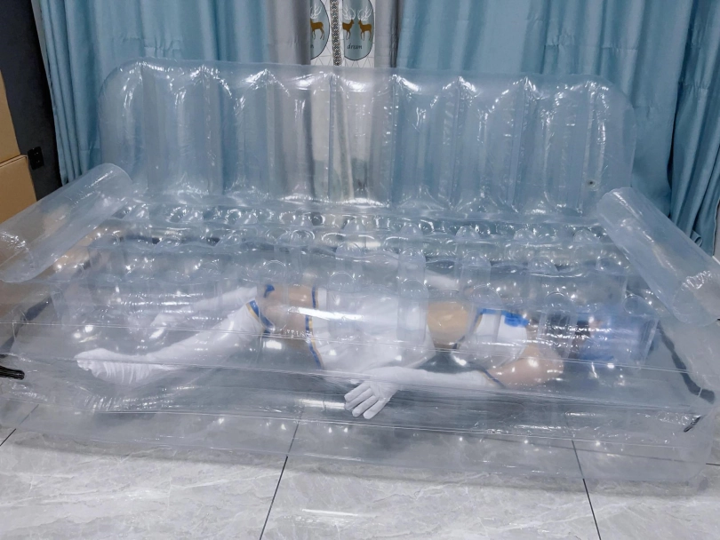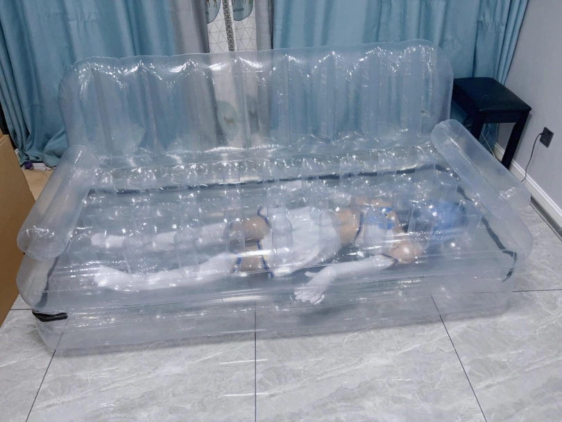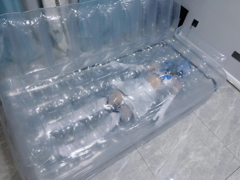 可怜的露娜酱就这样被封印在透明的充气沙发里,忍受着闷热、缺氧和充气拘束的压迫感,被人使用着。