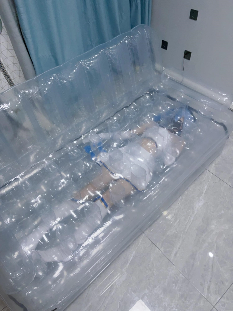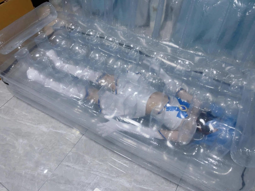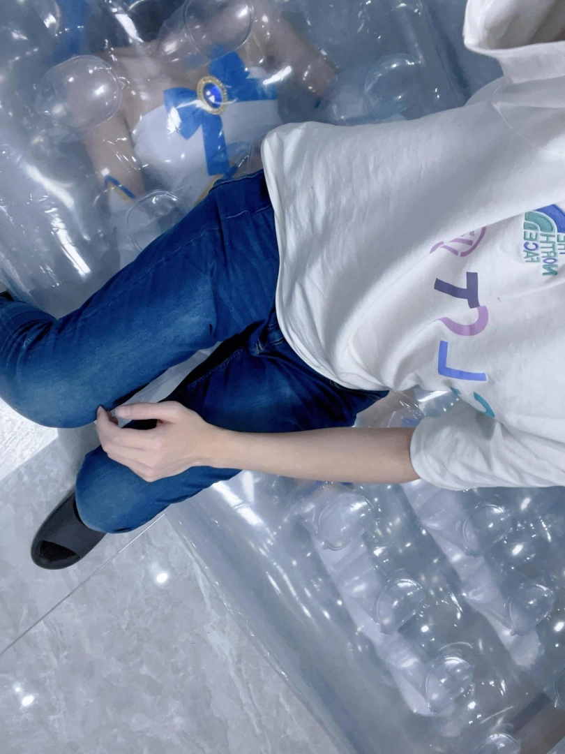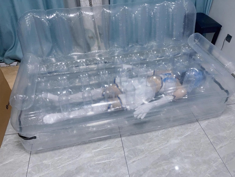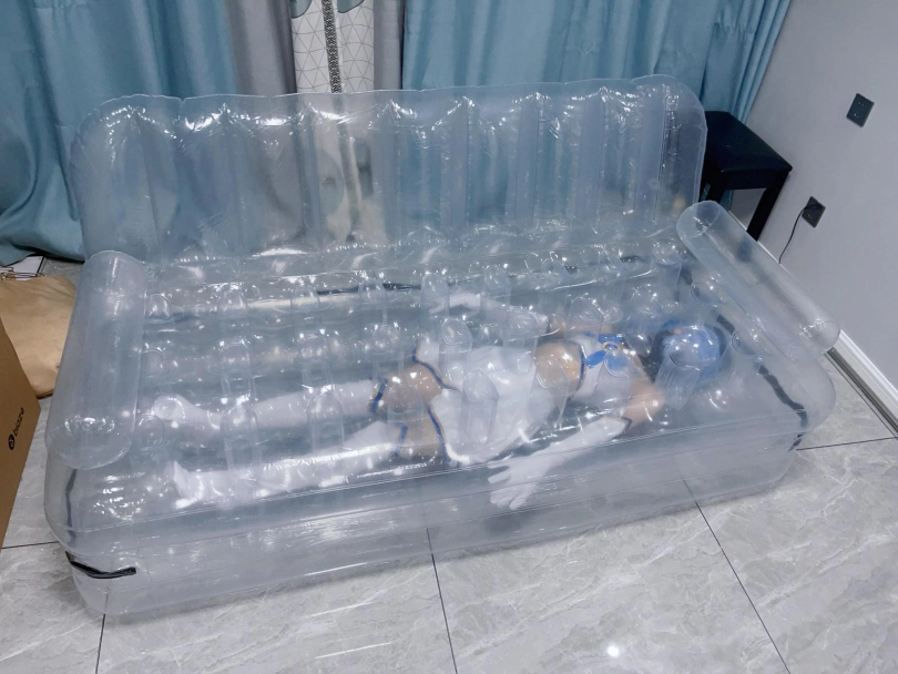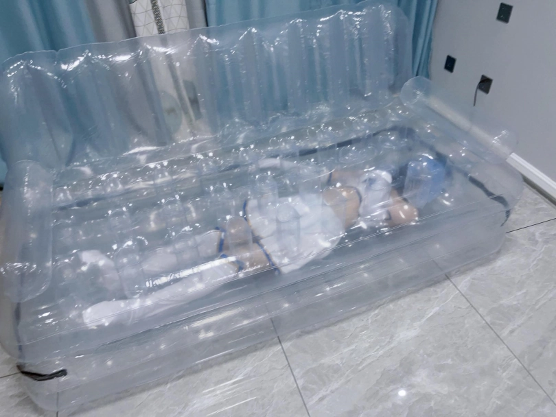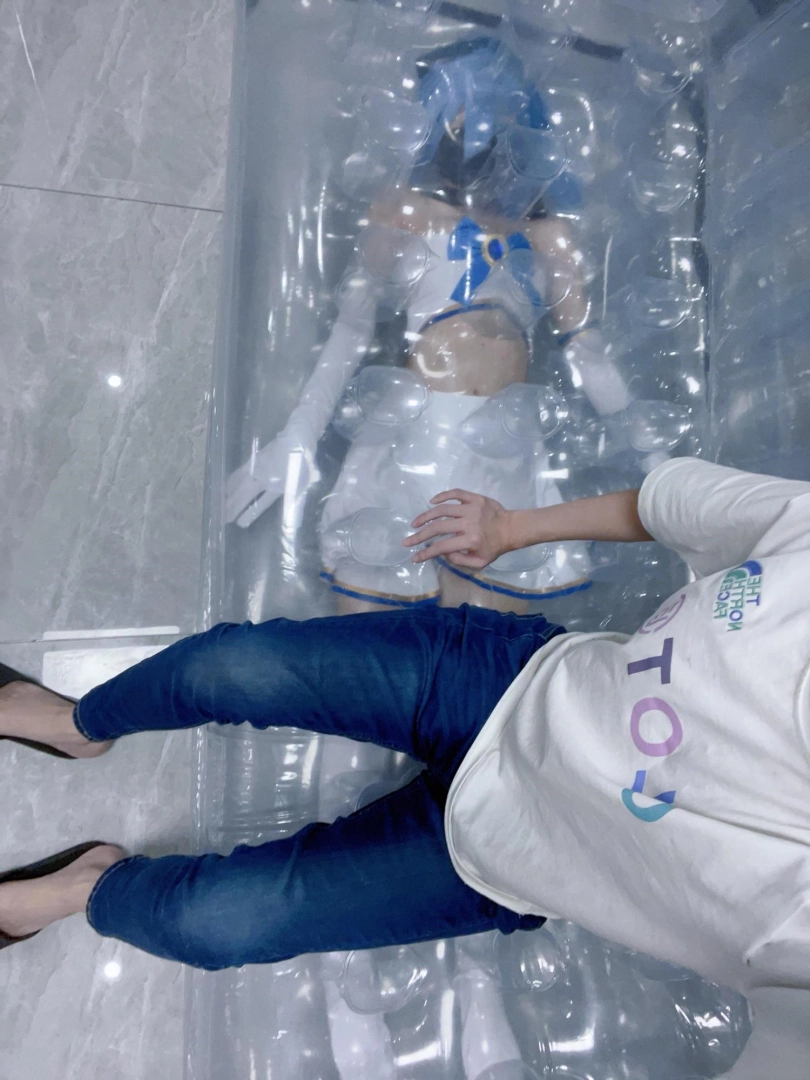 可怜的露娜酱就这样被封印在透明的充气沙发里,忍受着闷热、缺氧和充气拘束的压迫感,被人使用着。
