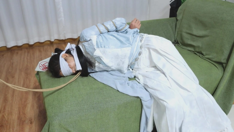 将她绑好后将她双手吊高,用白布蒙上双眼,摘了她的面纱,再背后插上亡命牌,果然,女侠的口中还塞着白布袜呢,怪不得有口难言。