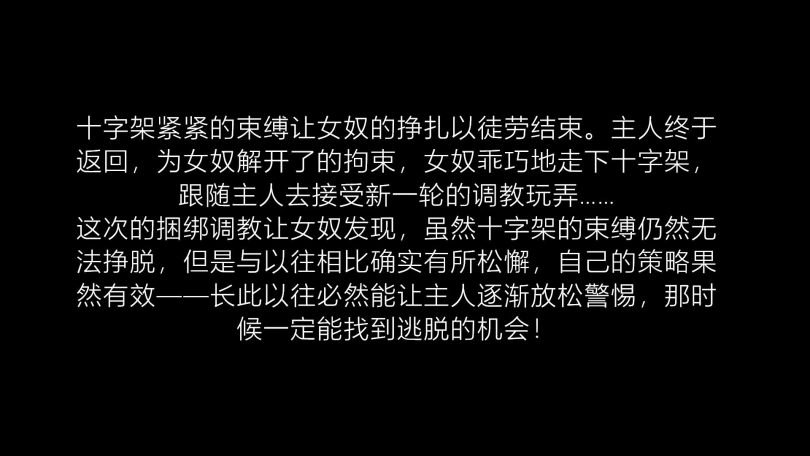 主人终于返回,解开了女奴的拘束。女奴乖巧地走下十字架跟随主人离开房间。这次的捆绑调教让女奴发现,虽然这次的束缚仍然无法挣脱,但是跟以往相比确实有所松懈,自己的行为果然有效。长此以往必然会让主人逐渐放松警惕,那时候一定能找到逃脱的机会!