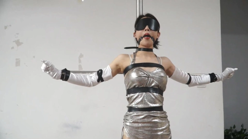 女奴假意逢迎请求主人把自己紧紧绑住,主人于是给女奴戴上了眼罩和口球,又用皮带紧缚住女奴的脚踝,双腿和身躯。主人欣赏着女奴,不时地爱抚,女奴配合地扭动娇呼。