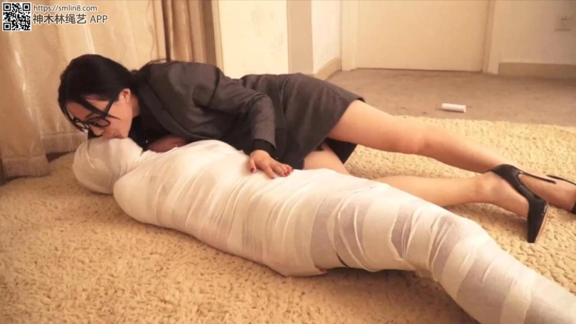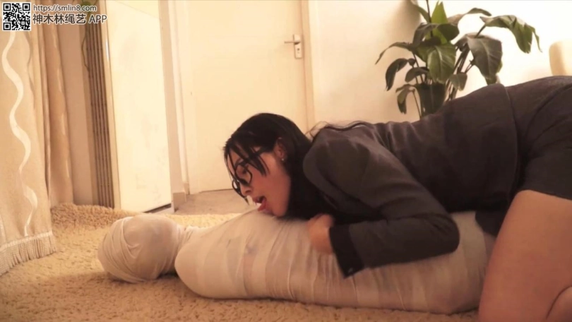 依然被老师用白色的纱布从脚裸一直包到脖子处,密不透风,依然童鞋感觉自己快喘不过气了,然后老师用一双黑色的连裤袜把她嘴巴堵上,再用另一条紧紧的蒙上,最后用依然因为失禁弄脏换下来的那条她自己的白色连裤袜套住她的脑袋,完成全包,再把依然放在地上慢慢调戏,佟亚的双手游走在依然的MM上,下体上,还闻舔了她的黑丝双脚,很刺激。