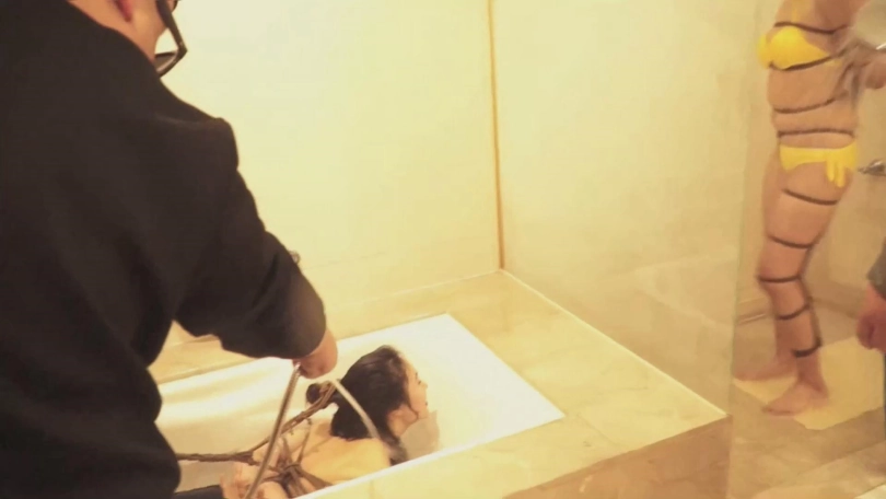 是和阿东相识的一天里也学会了一点技术,而玻璃围挡的淋浴内,小晗穿着一件和 内衣相似的泳装,被捆绑着正被阿