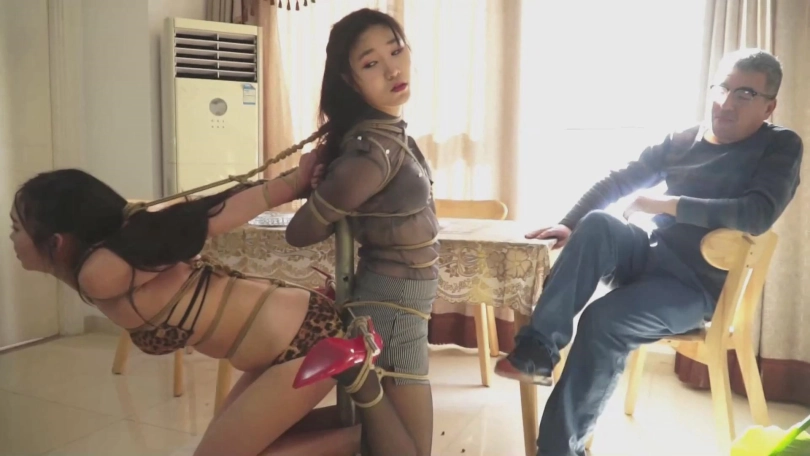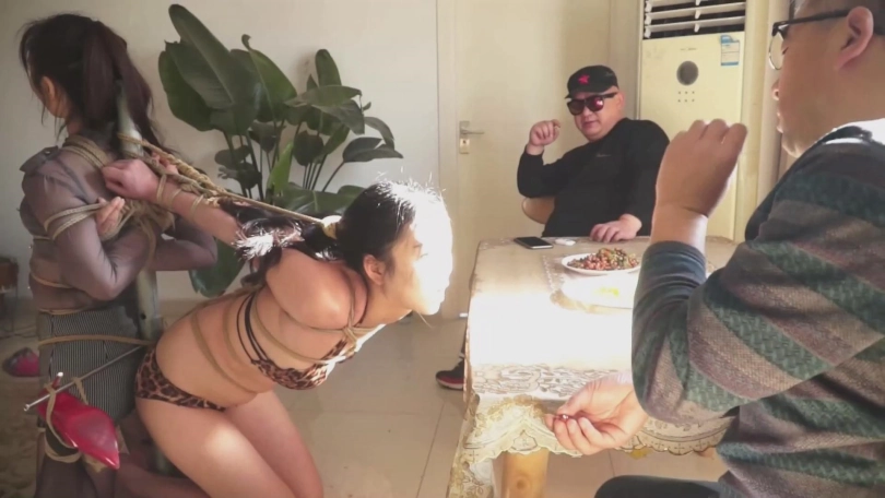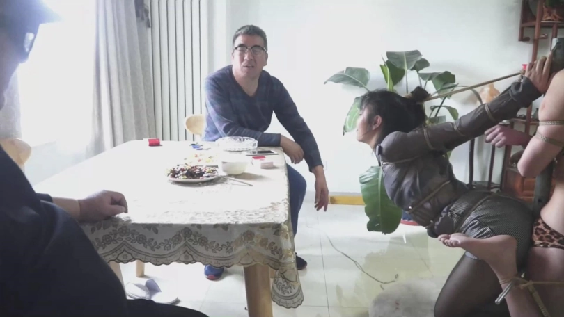 换了服装,被紧紧的捆在转动的转盘上,时不时的被王力和阿东喂一口菜。两人讲着捆绑体会与女人的故事,阿东抽