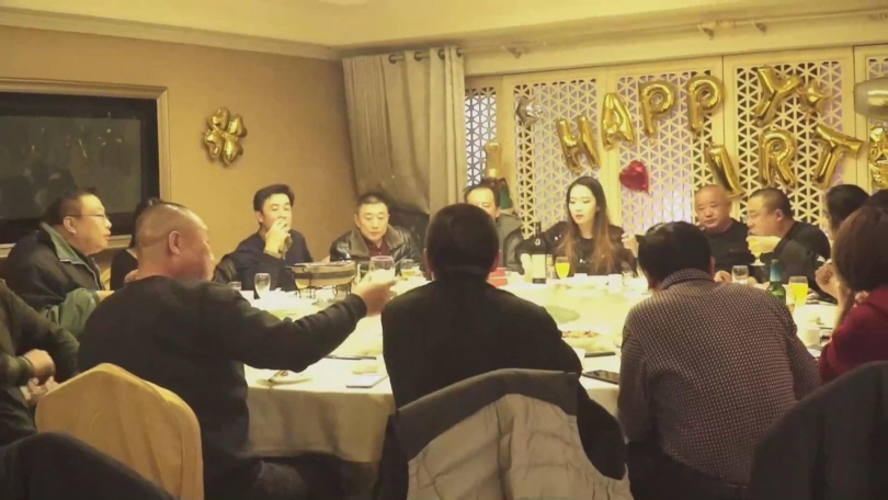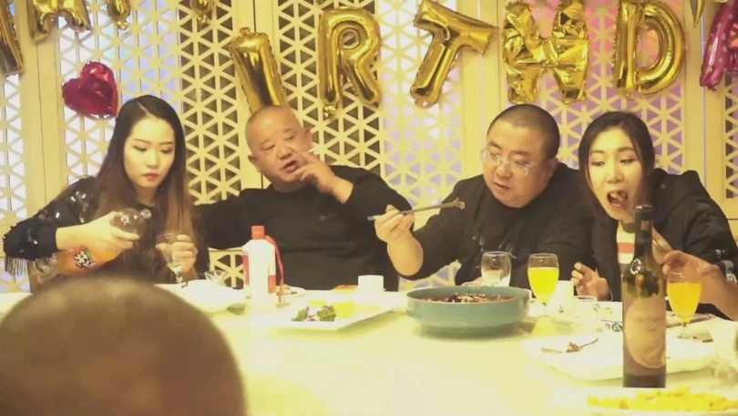 王力家,一张长条桌上摆着酒菜,王力和阿东正在推杯换盏,在桌子旁边一个转盘上捆绑着雨彤和小晗,两人都