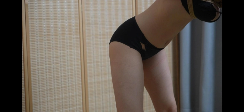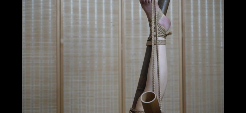 小0的柔韧性是真的好,两段都是难度比较高的捆绑。第一部分用一根竹竿将小0的腿折叠捆绑好,另一条腿被绳索高高吊起,在用绳索固定住。第二部分将小0后手驷马捆绑好之后,用绳索固定住竹竿,随着绳索的拉动,小0的身体也被缓缓的吊起。小0的身材线条非常好,柔韧性也很强,两部分都是比较考验模特柔韧性的。