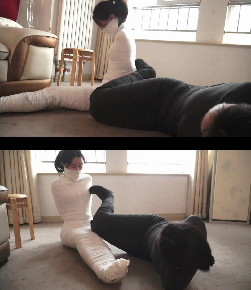 没一会,2位可怜的美女就被绷带包裹成了如同埃及的木乃伊一样,变成了2个只能蠕动的人棍。