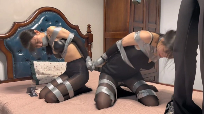 就在2个人试着用手解缚时,坏人出现了。坏人将她们的双手分别捆绑成小球。