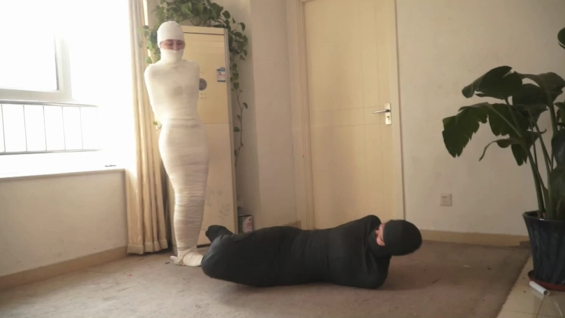 之后2个被包裹的只露眼睛的木乃伊美女的各种挣扎,互相磨蹭,累的全身香汗淋漓。