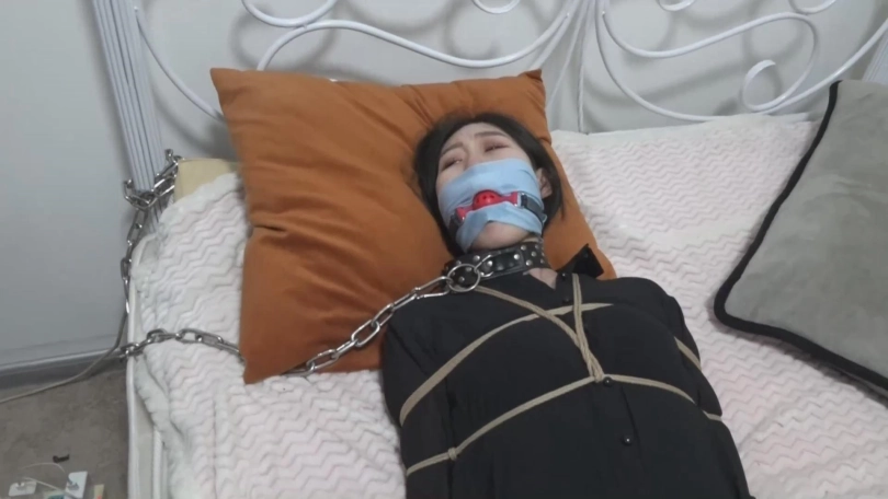 好心的我重新给她做了消音服务并且用项圈把她栓在床上,