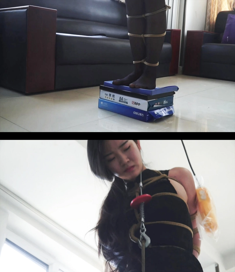 警迷迷糊糊的清醒过来,发现自己被连接着股绳吊起来,丝袜脚下放着几本厚书。