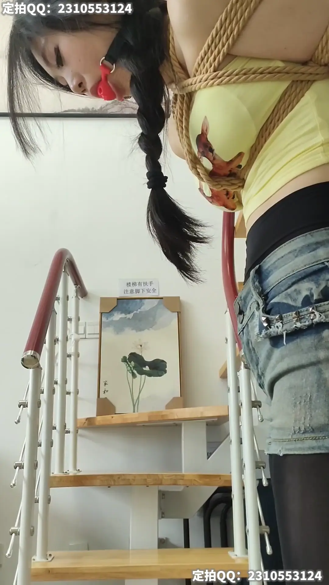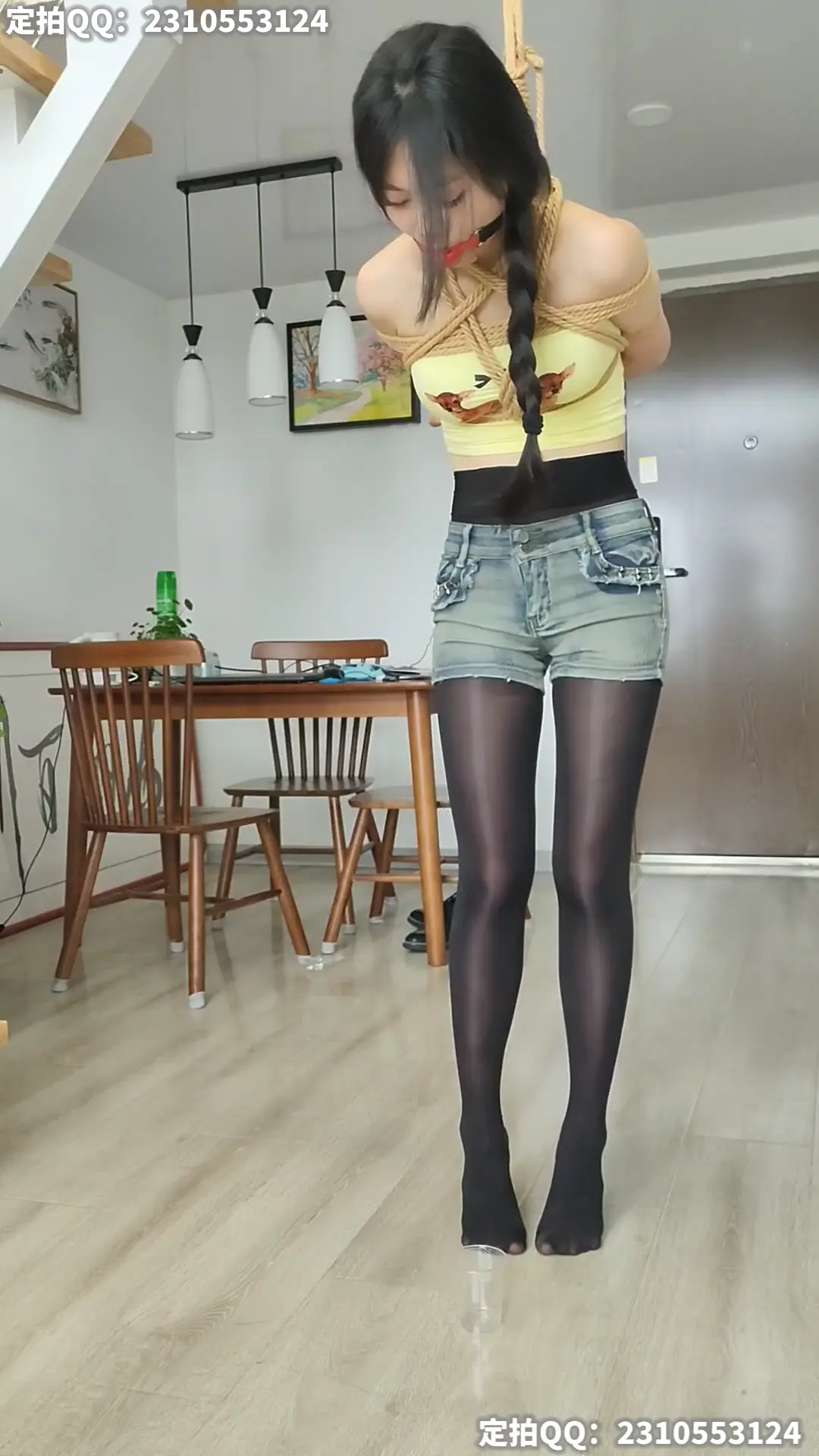 模特穿短裤黑丝被半悬吊带上口球,脚下放杯子收集口水,脚尖能刚好接触地面保持20分钟