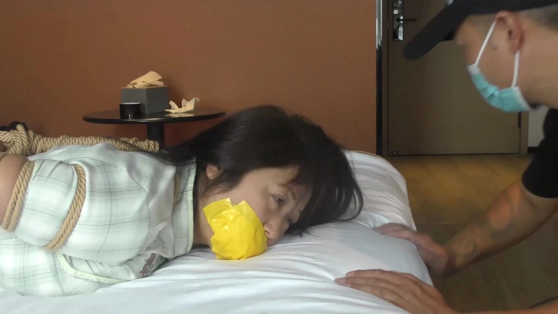 歹徒去翻找财物,老阿姨奋力挣扎弄松绳结,准备解开绳子逃跑,但被歹徒发现严厉捆绑并捆成驷马。