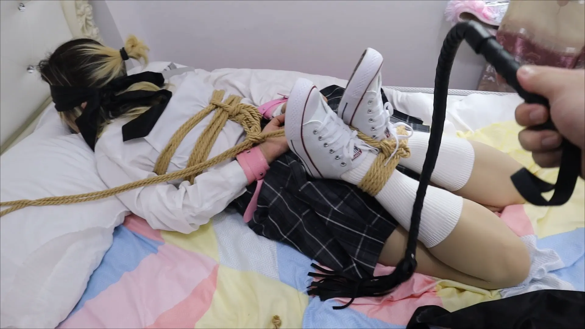 【荷仙少女】又见少女H鞭打挠到抽搐 帆布鞋长筒棉袜+简驷马缚+塞嘴+封嘴+鞭打虐待+驷马挠+最后女孩H旁白讲话,强行把布条完整塞入少女H嘴里塞满并用胶带封住,双手粉铐撩绳子拉住脚上的绳子弯曲腿部,使劲