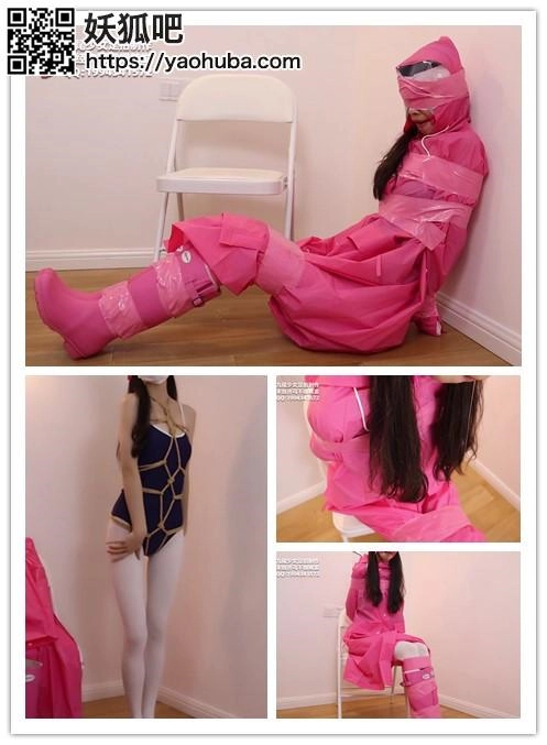 【九尾少女】白丝死库水雨衣胶带拘束,死库水龟甲缚捆绑,胶带多重拘束挣扎