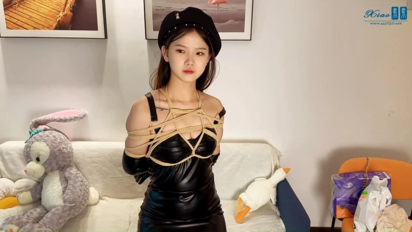 漂亮的女模特时尚短裙黑丝展示唯美绳艺,