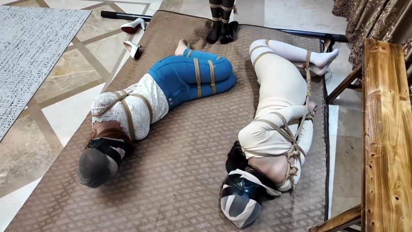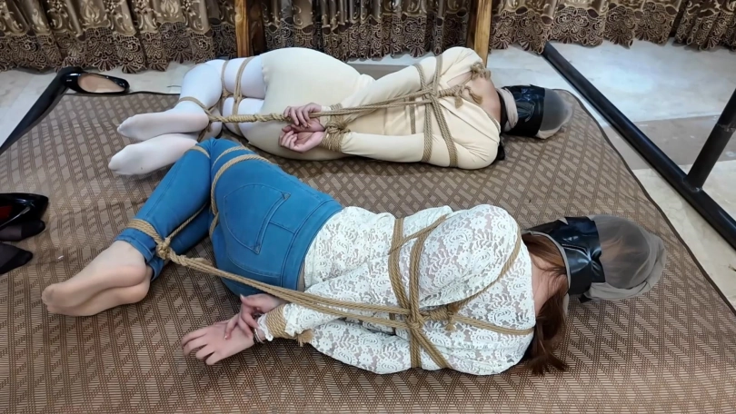 女老总站在柱子前,双臂交叉放在柱子后被绳子绑在一起,上身和柱子绑在一起双腿先用绳子绑住脚腕和膝盖,然后和柱子缠绕在一起捆绑好。两位保镖竞选人也都被驷马捆绑起来,三人都被会不断勒紧的丝袜套住脑袋。南清一番挣扎无果后,昏了过去,女老板大声呻吟求救。最终是诺澜成功脱缚,她解开自己的捆绑后赶紧摘下老板脑袋上的丝袜与堵嘴,之后再去营救南清,最终昏了过去,这一切被女老板看在眼里。