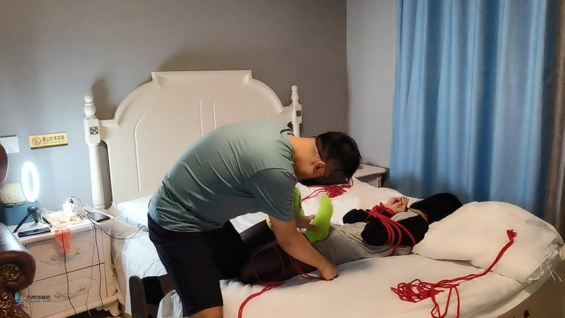 柔韧度还是很不错的。用红色的绳子将上半身绑成后手观音,再加上分腿缚,最终绑成驷马姿势。本来想丝袜堵嘴的,但她比较排斥,所以就没塞嘴。用丝袜头[X_X]头,胶带缠绕嘴巴。当然,脚趾头也不能发过,用一根比较细的绳子把她脚趾头也绑起来。嗯,完成,开始挠她的脚心。激辣只能小幅度的挣扎,呜呜叫。