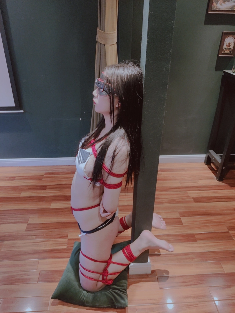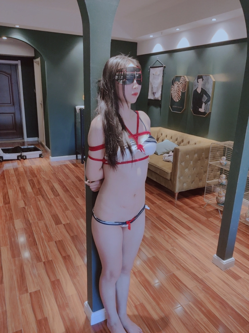 内衣美少女穿着暴露的比基尼,双腿被分别折叠捆绑,强迫少女膝盖着地跪立着接受震动强高、挠痒、轻微虐腹等调教。