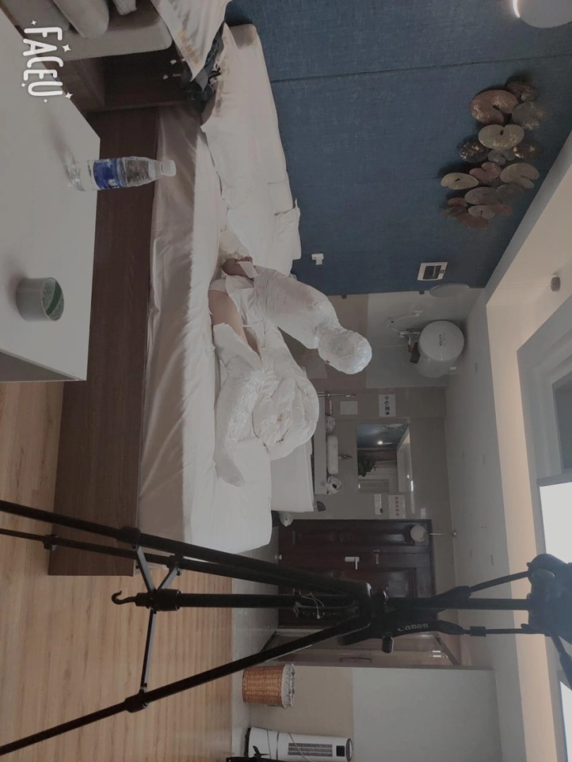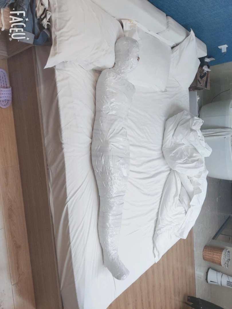 这次的挑战内容是:先用保鲜膜缠绕打底,然后用白色的布基胶带把轻酱包成木乃伊哦。