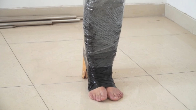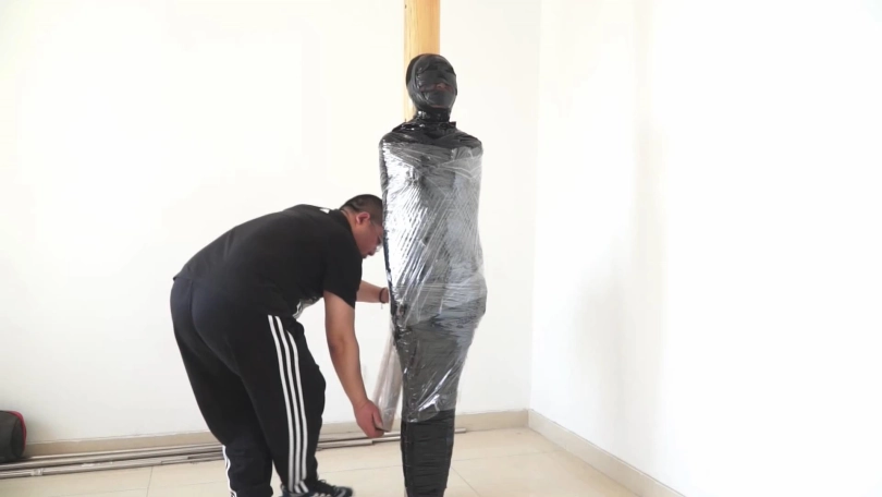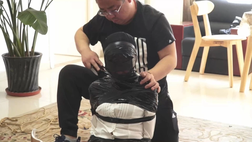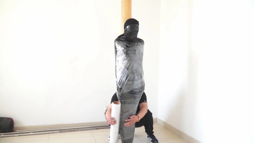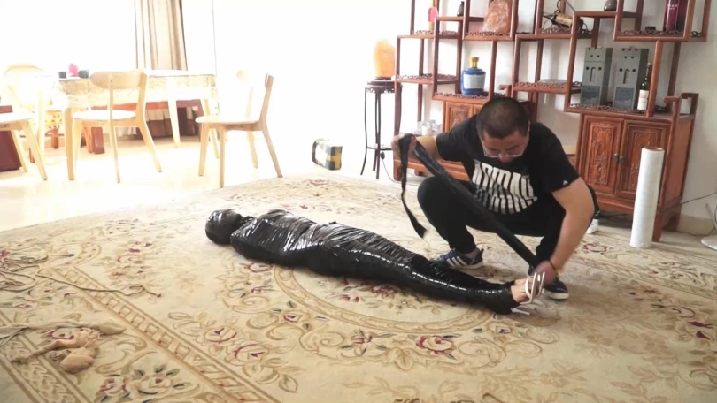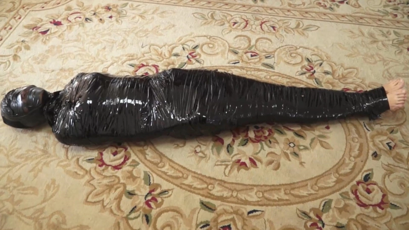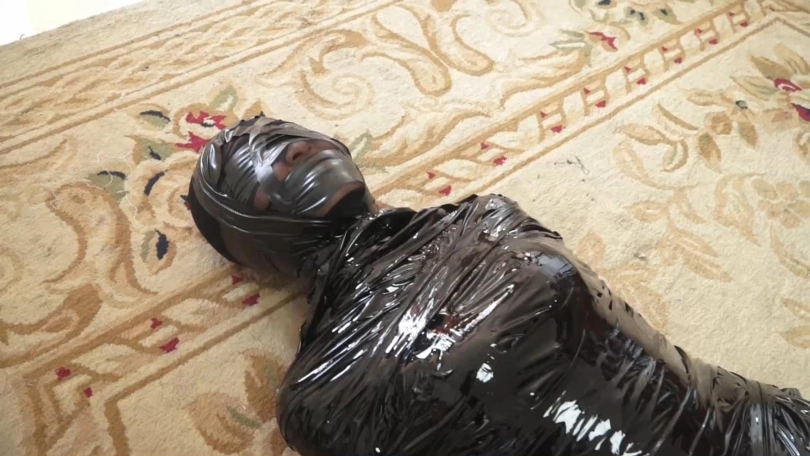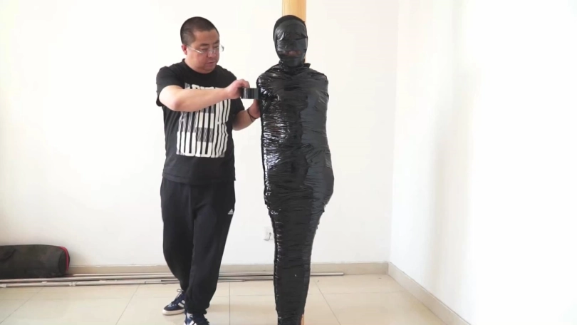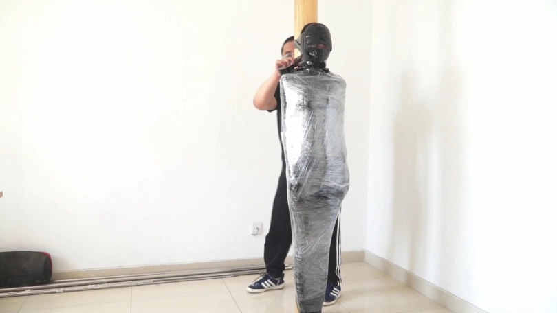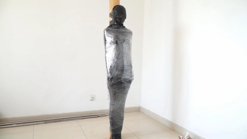 白领被黑丝袜蒙住头,胶带蒙眼堵嘴后,又被黑色胶带一圈一圈裹成了木乃伊,毫无逃脱可能。最后被封在木柱上,用胶带和保鲜膜固定,只能像一件展品一样供人观赏了......